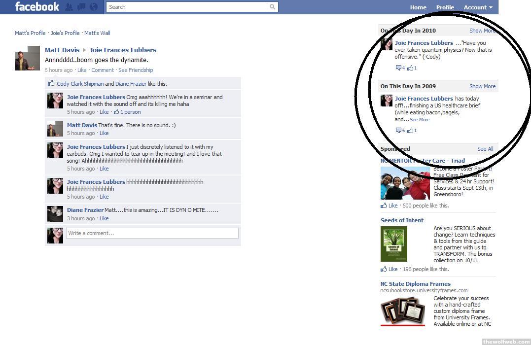 occasionally if you look at the right of your facebook page, it will have a "this year in 2***" (or something like that)and it will have your facebook status from this day one year ago.ill see if i can get a screenshot.[Edited on August 25, 2011 at 5:51 PM. Reason : fdgfg]