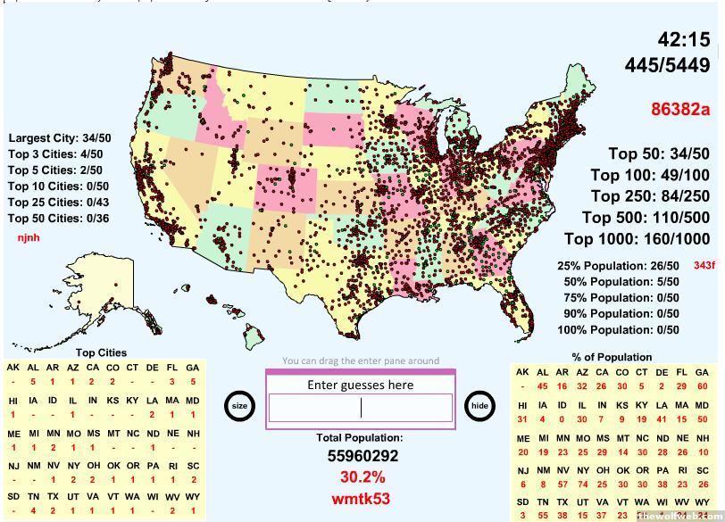 http://www.sporcle.com/games/nsxdarin/ultimate-us-city--map-quiz-I managed to name 681 cities but it took over half an hour and lots of guessing. How good can you do without looking anything up?I also got 62% of North Carolina's population, but barely 25% of Massachusetts where I live now.