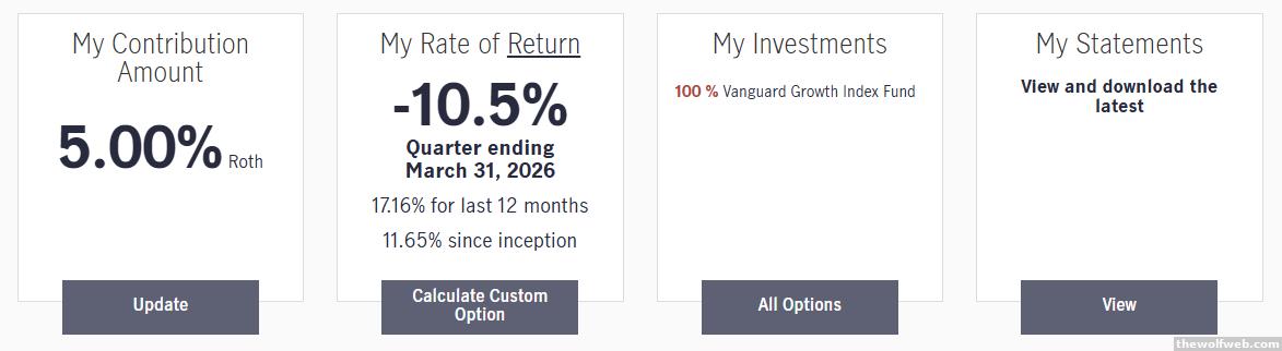 ^^I guess I'm a little confused about what you're trying to show?The first time you posted returns, I thought maybe it was a humble brag about 12-month and since inception returns since those were still pretty good.Quarterly returns is kind of an odd way to look at long-term investments.And is "since inception" meaning the inception of your account, or the inception of your chosen investment fund? And is that an average annual return since inception, or a total return? I know for sure that's not a total return on Vanguard Growth since the fund's inception.I'm not in any way defending the Trump economy. But I've got no better option than long-term investment in U.S. stocks. Apparently even when we have a lunatic at the helm. . .Growth stocks have been on a tear for a long time, but sometimes value stocks rotate into the lead. You might be picking a style preference without realizing it.If this is the first negative you have ever seen, you're doing great. You should expect more quarterly negatives, and even negative years in your investing lifetime.]
