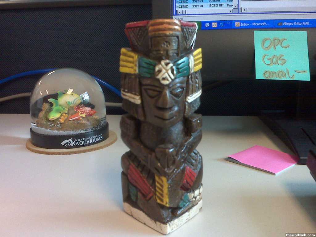 a Dwight Shrute bobble heada pencil with monkey on the top with dangly and movable arms and legs (don't know why there isn't a tail too...)a wolfpack "beanie baby"container of Twinings breakfast tea, a tea pot and teaspoon infusera fake green daisy in a little flower vase with blue glass in the bottomsometimes there's a rubber chicken that lays a goo blob egg, or a rubber cow that poops goo blob. they are both toys that we pass around the office and hide in someone's office for them to find.[Edited on August 12, 2009 at 11:04 AM. Reason : ]