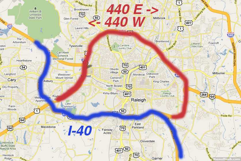 Now we have this East/West bullshit. Makes no fucking sense. If I'm on the southern part of the betline, I-440 West will take me East. And if I'm on the northern part of the betline, it will take me West, and if I'm on the western part of the betline, I-440 West will take me South, and if I'm on the eastern part of the betline, it will take me North.