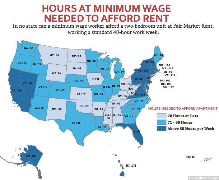 A girl on my facebook used this picture to start a discussion on why minimum wage should be raised. According to the picture, for "a minimum wage worker" to be able to afford a two bedroom place at "fair market rent" the minimum wage would need to be $13.60.Is the minimum wage too low or the rent "to damn high"?I say raise it to $25/hr. What say you?