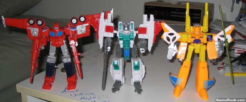 Got some pretty cool KOs today at Big Lots on Western. They're Legends of Cybertron molds made into figures that are between basic and deluxe size. The colors are pretty good, and the Prime has the wings and weapons from the leader size Galaxy Force Prime that the LOC figure doesn't. They all come with guns that the LOCs didn't have, but they're sort of pointless since the molds don't really bend at the elbow. Starscream has a gun and a sword that fold out of his wings, but I forgot to put them out. Evac looks damn good in vehicle mode. Not bad for $6 total.Jetfire and Megatron are on the cards, but I didn't see any in the store. I left another Prime and a Hot Shot (didn't like the colors). Also of interest is that the art on the card is of the genuine leader- and ultra-size figures (unlike the G2 and Beast Wars KOs). ]